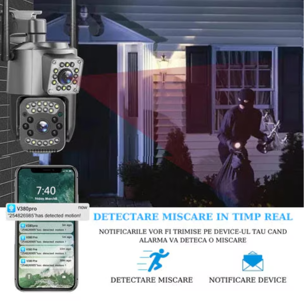 Calitate a imaginii Ultra HD 4MP 4K, oferind monitorizare clara zi sau noapte; Slot pentru cartela SIM 4G incorporat pentru conexiune wireless fara WiFi; Dispune de interfon vocal bidirectional pentru comunicare in timp real, vedere nocturna full-color pentru claritate detaliata in lumina slaba, detectare inteligenta a AI pentru identificarea precisa a anomaliilor si diverse optiuni de montare, inclusiv suspendare pe tavan si perete; Include functii precum detectarea umana, zoom digital 4x, protectie IP66 impotriva apei si un slot pentru card TF de 128G; Compatibil cu aplicatia V380 Pro si accepta acces de la distanta pentru mai multi utilizatori.