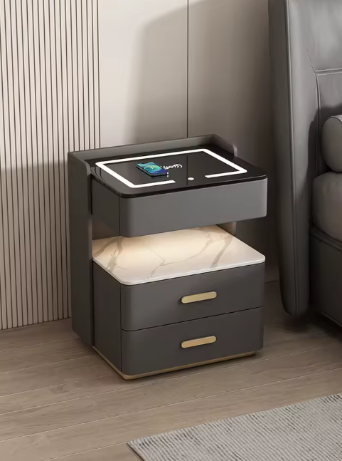 Această noptieră modernă include un sistem de iluminare LED reglabil, cu trei tipuri de lumină: rece, neutră și caldă. Poți alege nuanța potrivită în funcție de momentul zilei sau de atmosfera dorită, pentru un ambient plăcut și relaxant în dormitor.