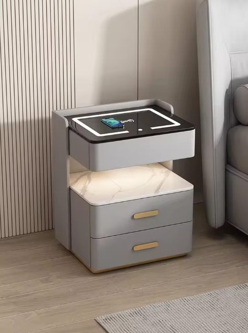 Noptiera inteligenta cu incarcare wireless, lumini LED reglabile, 3 sertare de depozitare, 50x40x56cm,gri deschis