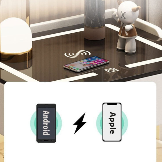 Noptiera inteligentă este dotată atât cu funcție de încărcare fără fir, cât și cu port USB, oferind flexibilitate pentru alimentarea dispozitivelor tale. Încărcarea wireless este compatibilă cu telefoanele care dispun de această funcție, iar pentru celelalte dispozitive poate fi utilizat portul USB.