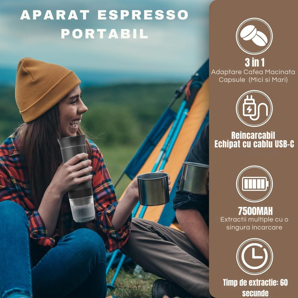Espressor portabil , 3 in 1, Fara Fir, 20 Bar, Baterie 7500mAh, Compatibil cu capsule si cafea macinata, Incalzire automata, USB-C, Negru
